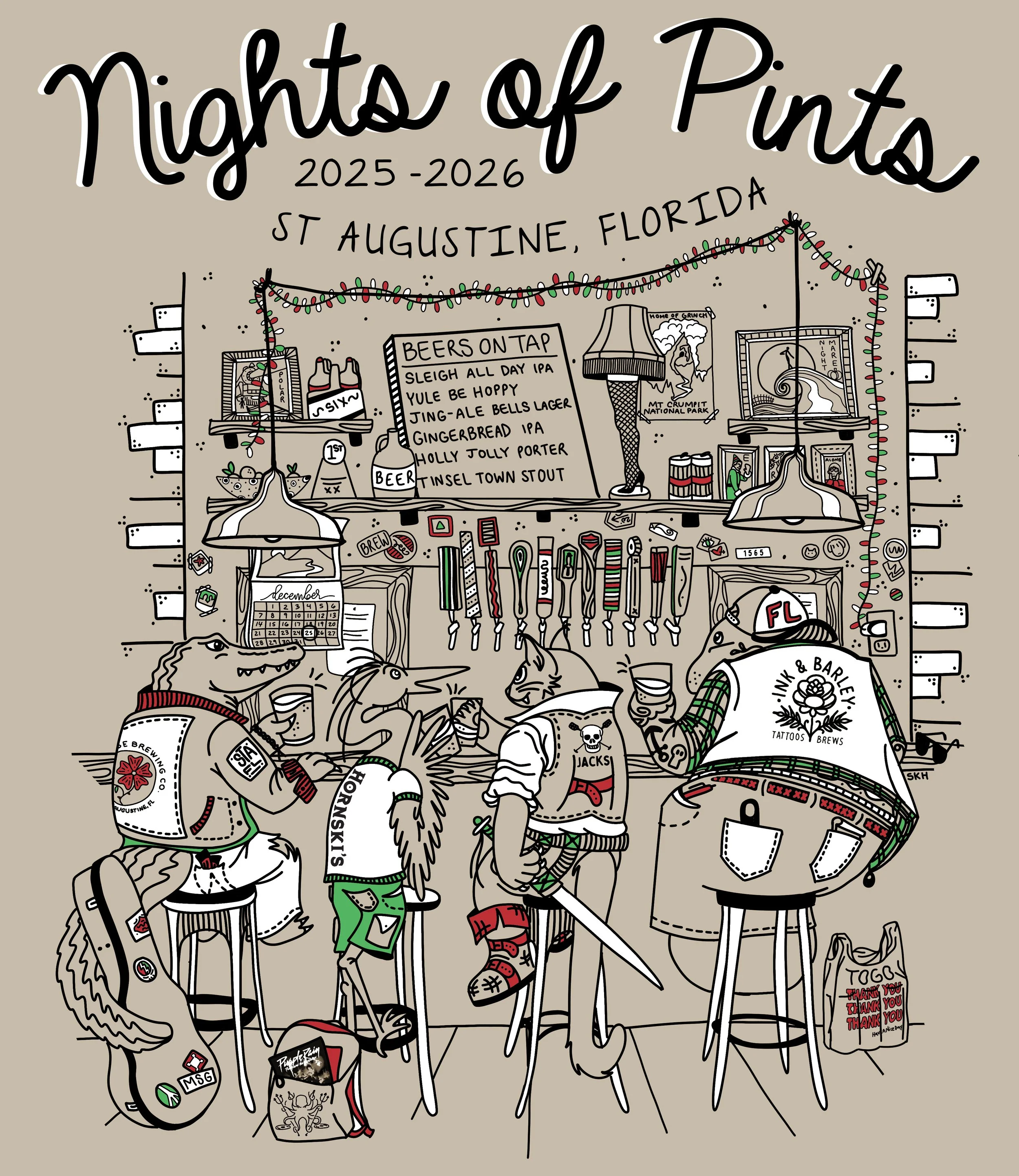 Nights of Pints 2025 is back and kicking off Friday, November 14 — right alongside Nights of Lights in St. Augustine! For $40, you’ll snag a limited-edition t-shirt that scores you a free beer at four awesome spots: Dog Rose Brewing Co., Hornski’s Brewing, Jack’s BBQ, and Ink & Barkley. A portion of the proceeds goes to support Betty Griffin Center, Boys & Girls Club, Epic-Cure, and Port of the Storm. Sip some local brews, enjoy the lights, and do a little good while you’re at it.
